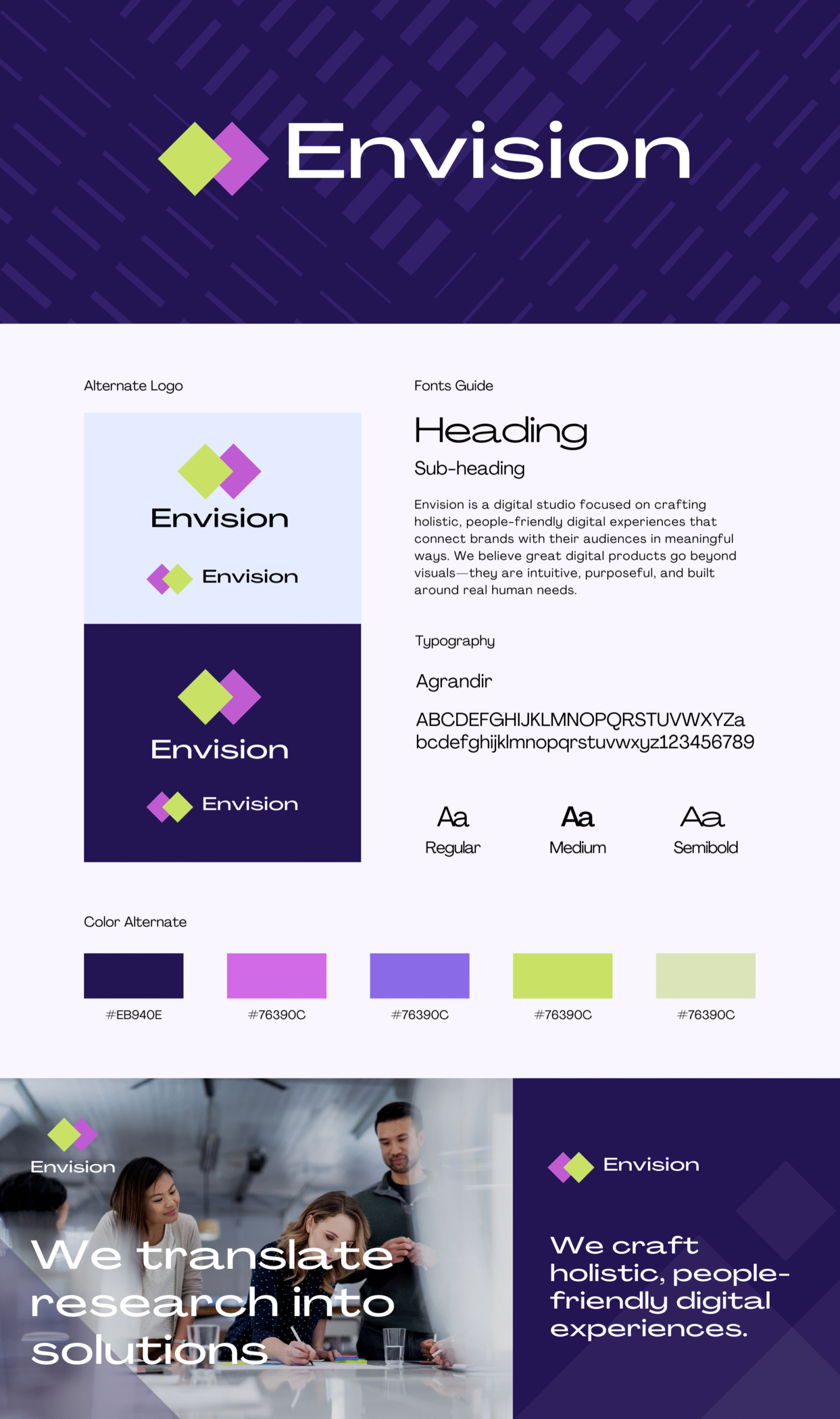 We provide logo variations, color palettes, typography, visual guidelines, and more.